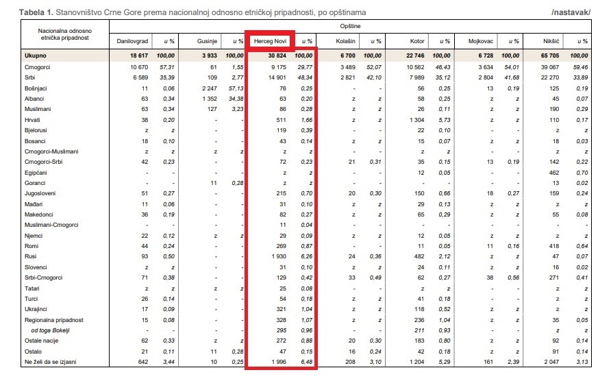 According to the official results of the population census conducted in Montenegro in the period from December 3 to 28, 2023, which was organized and conducted by the Directorate for Statistics of Montenegro (Monstat), the demographic structure of Herceg Novi is as follows: