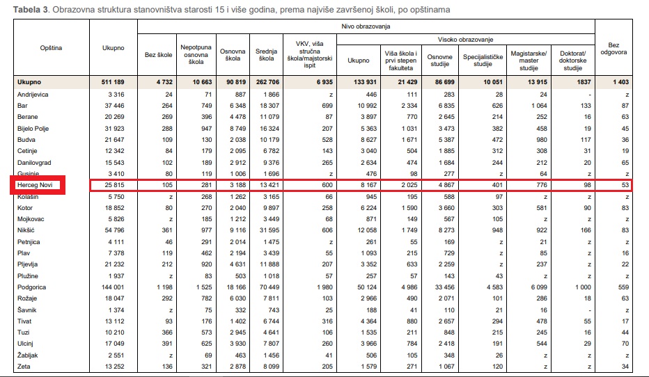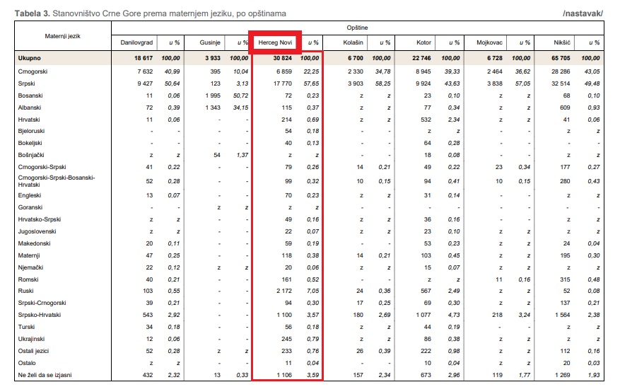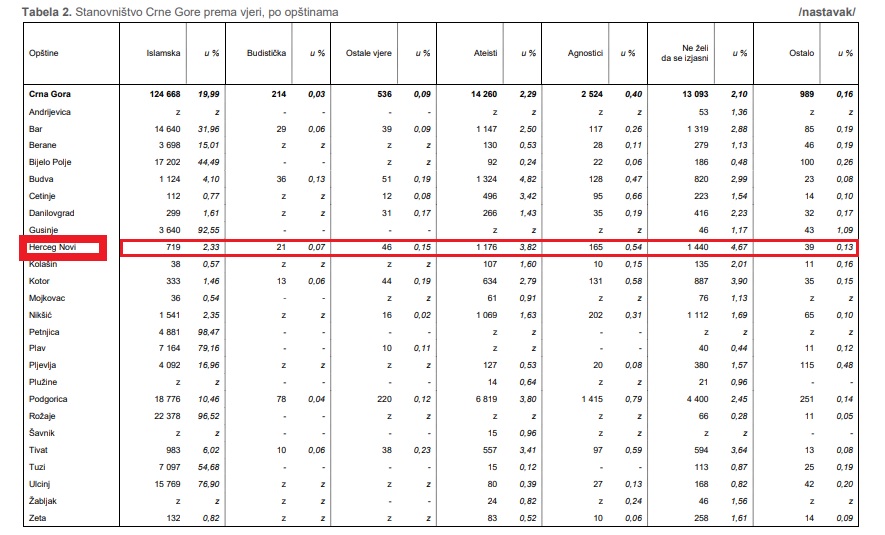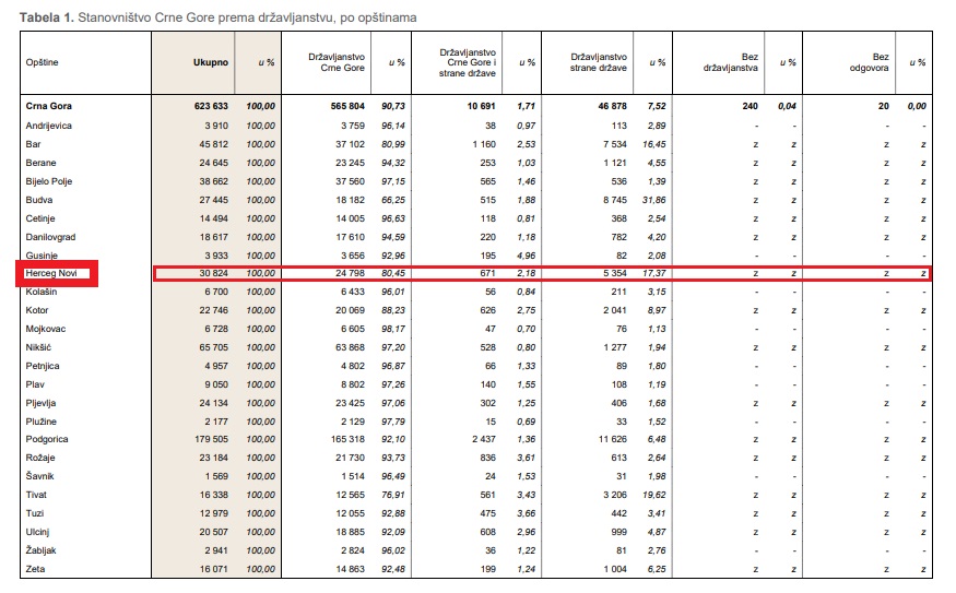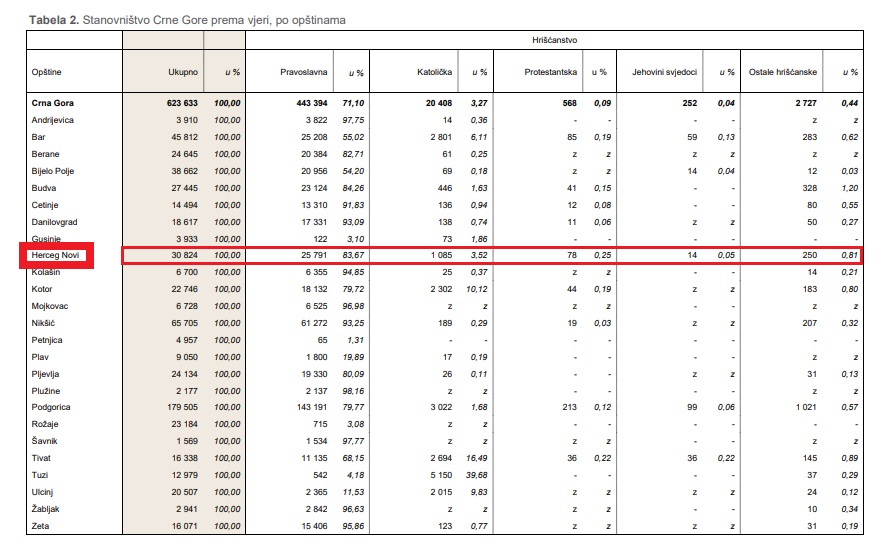 According to the official results of the population census conducted in Montenegro in the period from December 3 to 28, 2023, which was organized and conducted by the Directorate for Statistics of Montenegro (Monstat), the demographic structure of Herceg Novi is as follows: